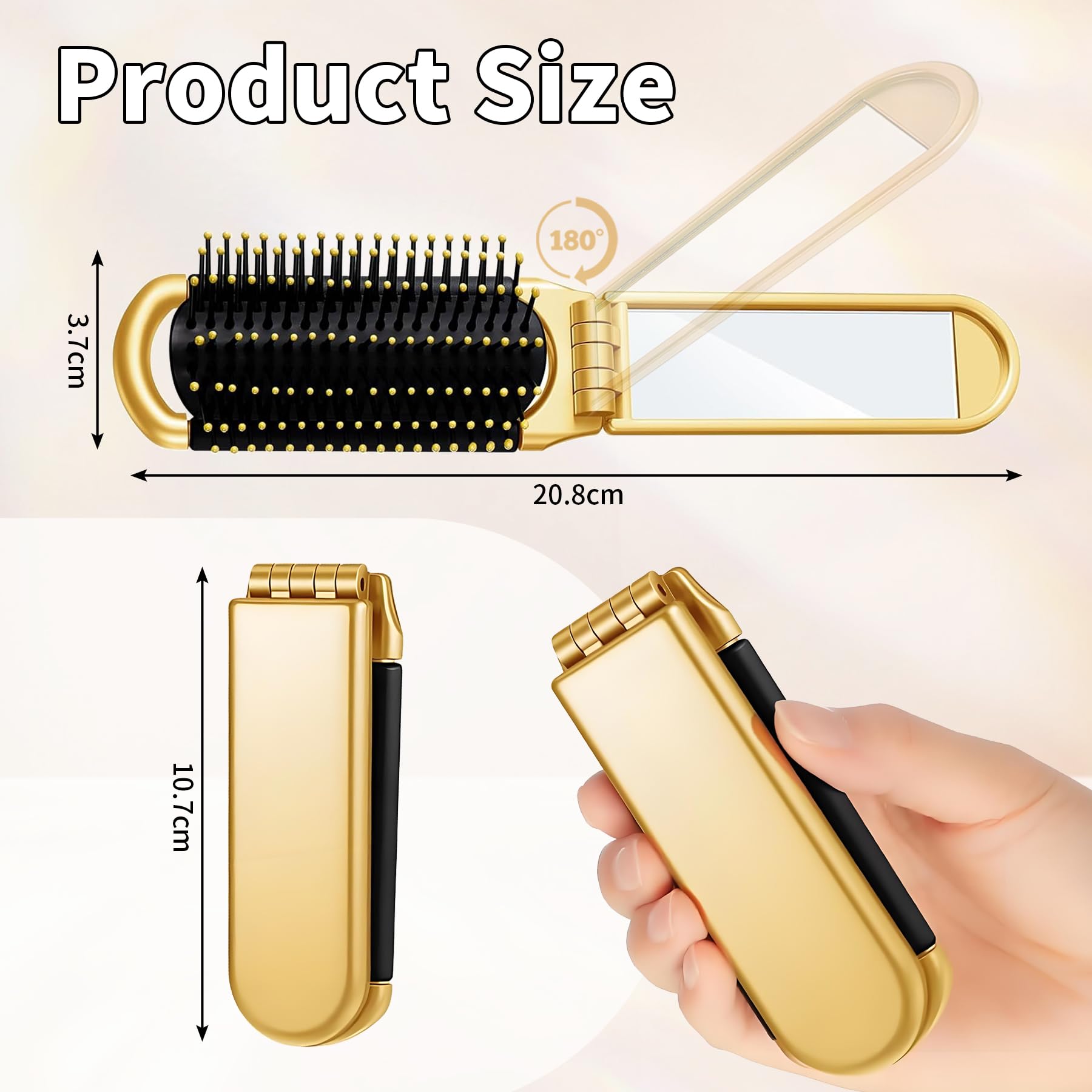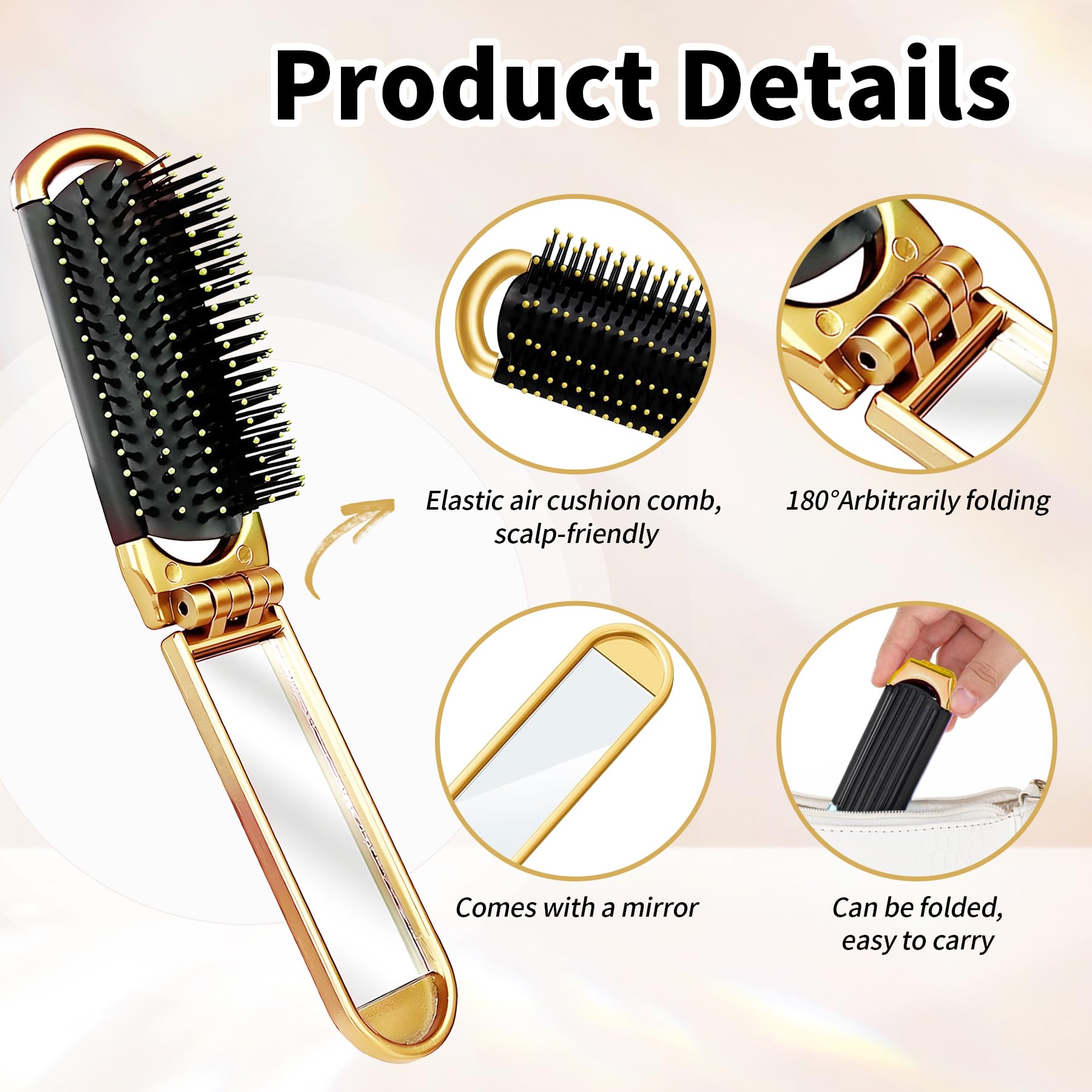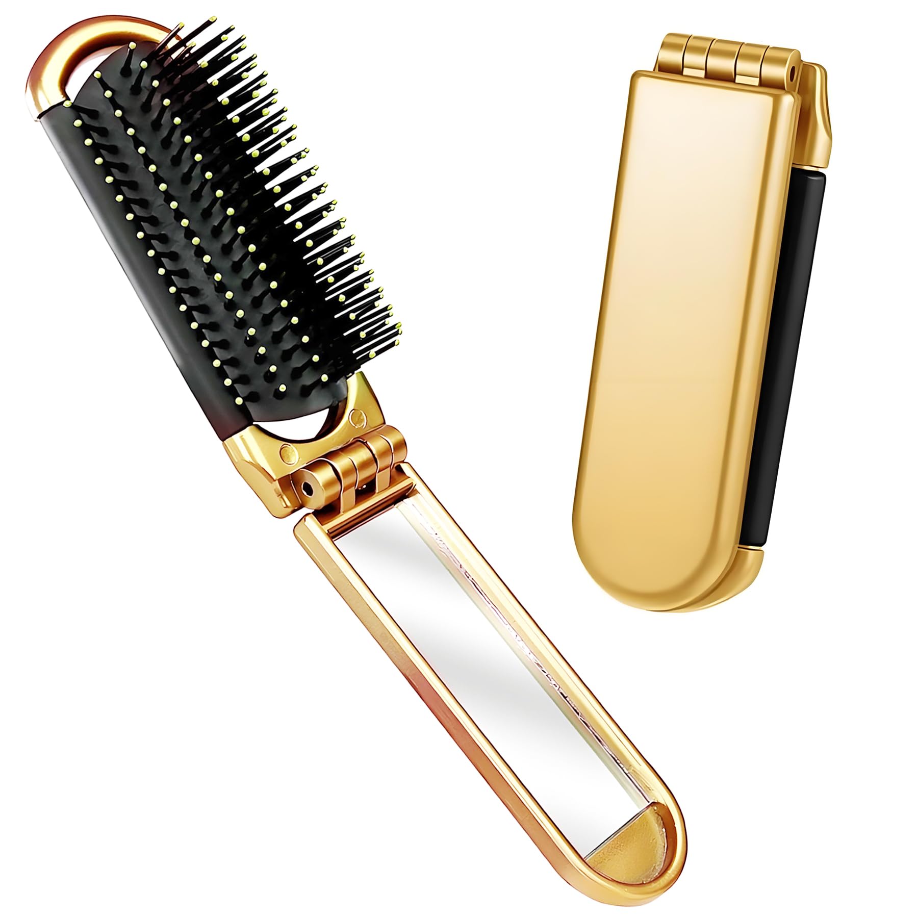 YPYMOD Faltbare Reise-Haarbürste, Reise Haarbürste mit Spiegel Faltbare, Tragbare Haar-Styling Kamm, für Männer, Mädchen, Frauen(Gold)