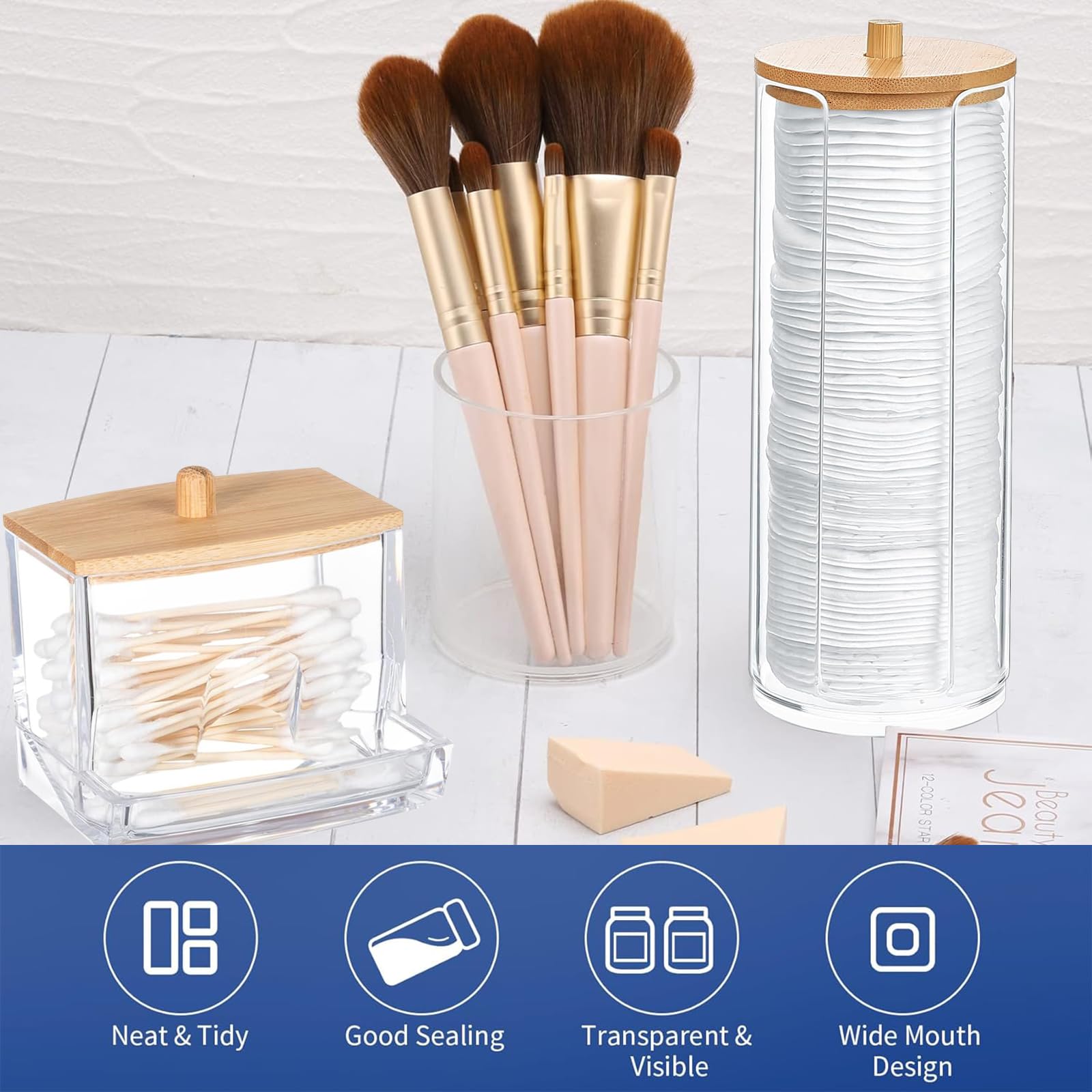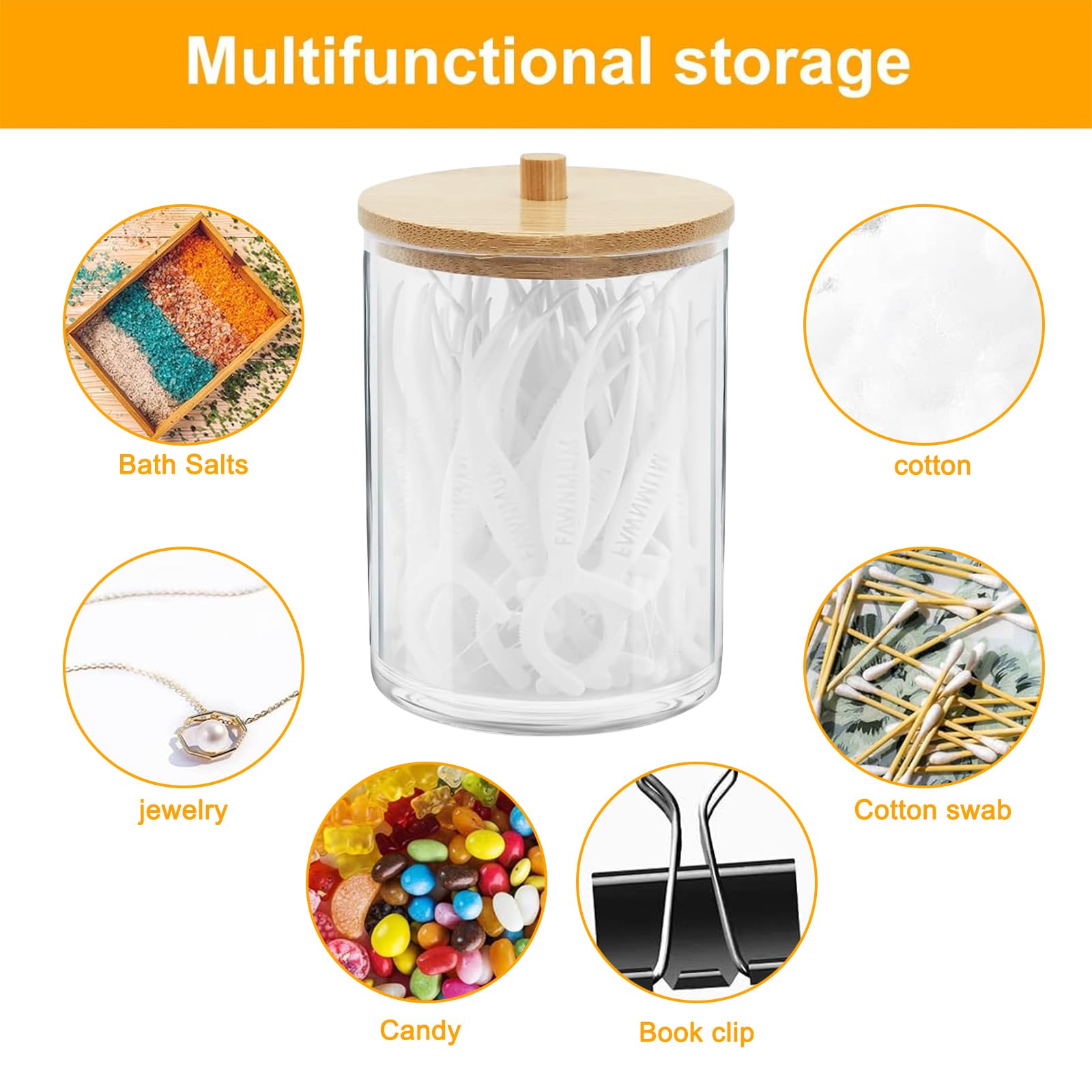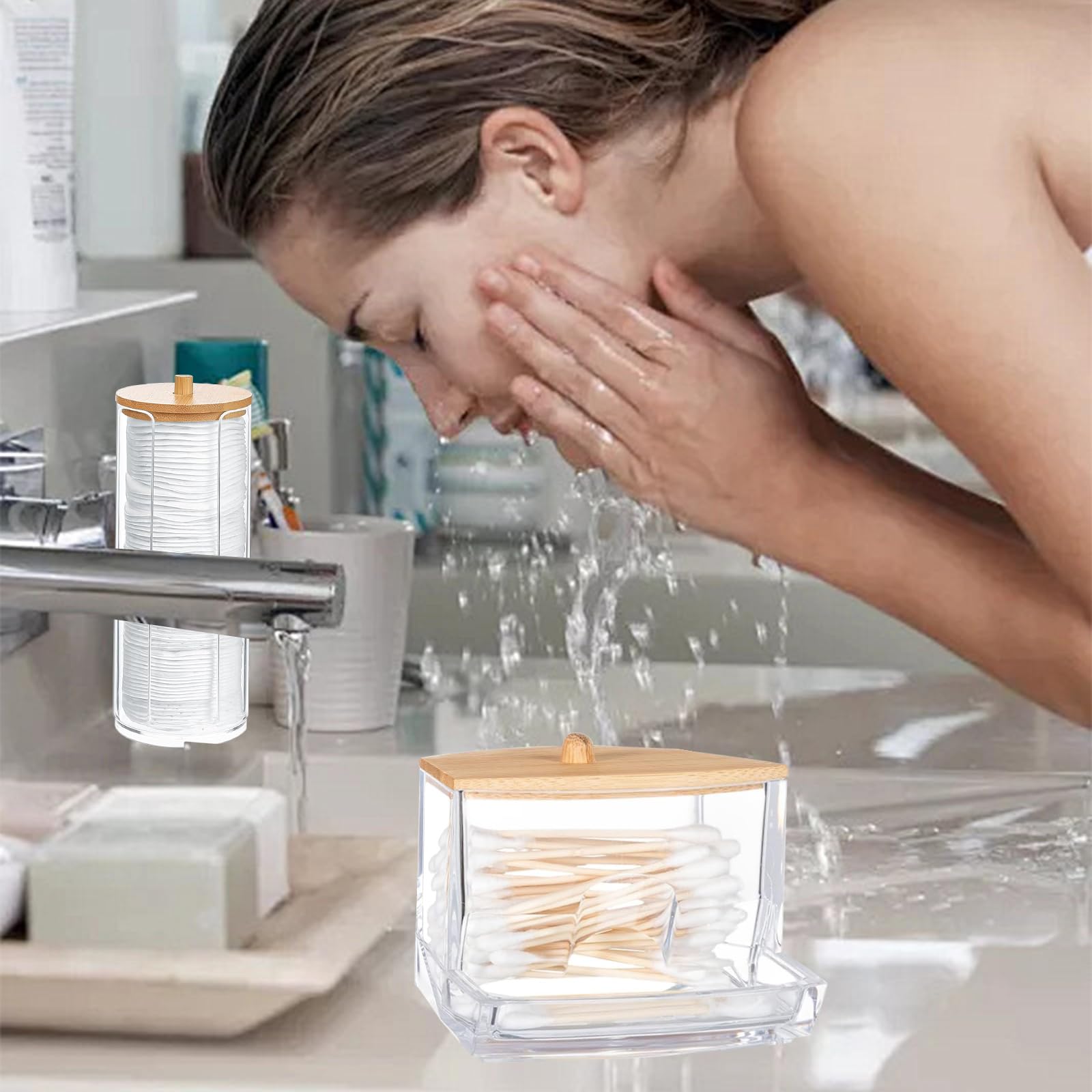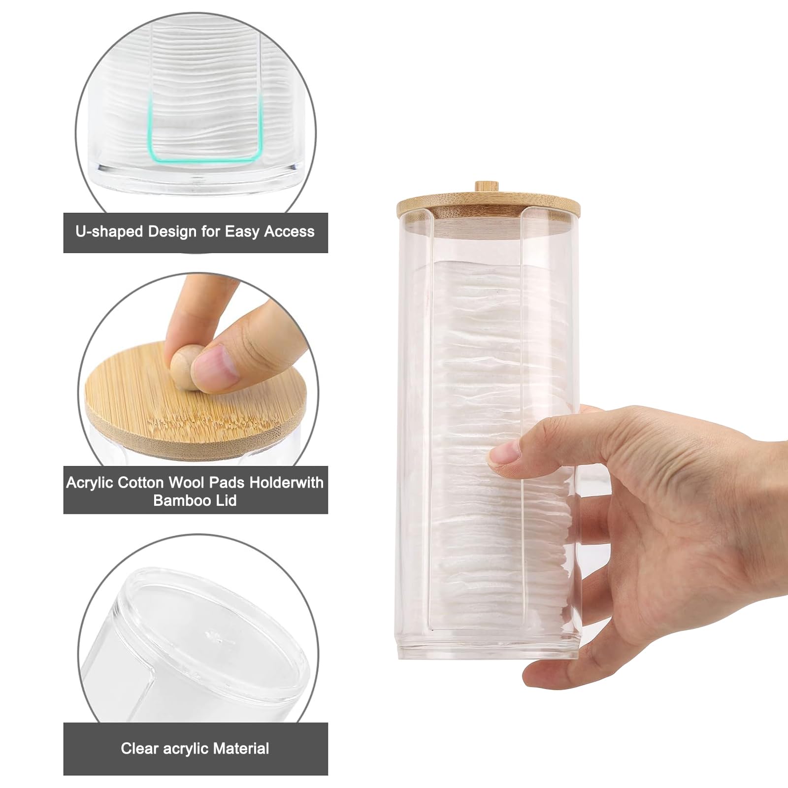 Verpackungsinhalt:1 x Wattepadspender (6,8''*2,4''*2,4'', 88g)1 x zylindrische wattepad halter (3,6''*2,8''2,8'', 63g)1 x quadratische wattepad halter (2,8''*2,8''*3,6'', 75g)Material: Flasche: PS, Bambusdeckel: BambusDie Wattepadspender- und wattepad halter sind aus robustem, transparentem Kunststoff mit abgerundeten Kanten gefertigt. Sie sind stabil, langlebig und leicht zugänglich.Die Wattepadspender- und wattepad halter bestehen aus hochwertigem PS-Material und sind daher langlebig, kratzfest und bruchsicher. Die Bambusdeckel sind wasserdicht, staubdicht, robust und langlebig.Diese Wattepadspender eignen sich nicht nur zur Aufbewahrung von Wattepads und Wattestäbchen, sondern auch für andere kleine Badutensilien wie Gummibänder, Nagelfeilen oder Kosmetikartikel.