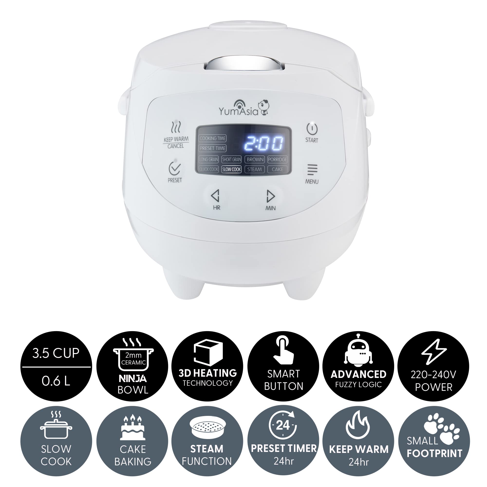 Yum Asia Panda Mini-Reiskocher mit Ninja-Keramikschüssel und Advanced Fuzzy Logic (3,5 Tassen, 0,63 Liter) 4 Reisfunktionen, 4 Multicooker-Funktion, 220–240V (Arctic White)