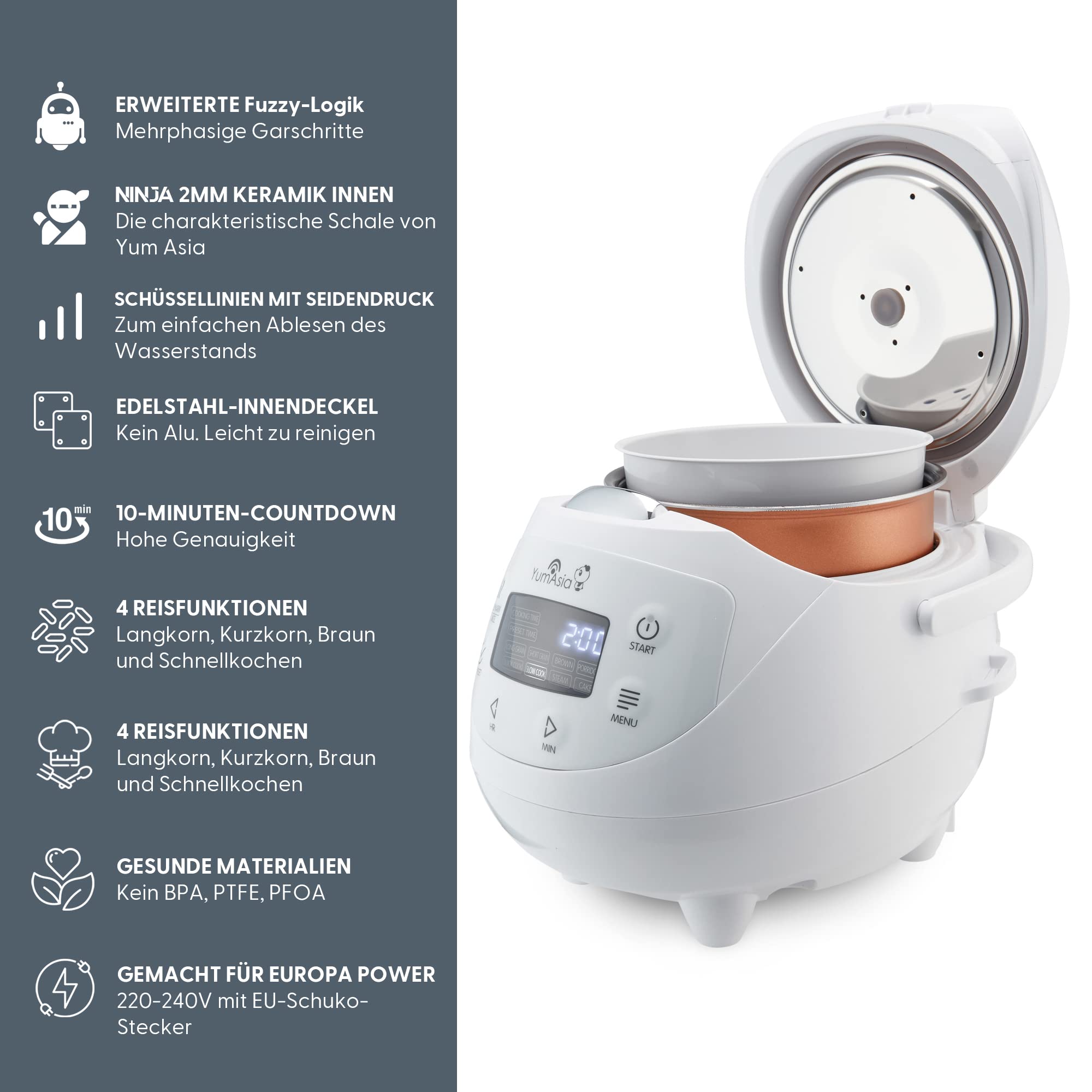 Der Panda ist zwar ein Mini-Reiskocher, aber unterschätzen Sie seine Leistung nicht. Ideal für Singles, Paare oder kleine Küchen – er kocht mühelos Reis für 1 bis 3 Personen. Der Panda ist Premium! Wir haben unsere beste Technologie in Design, Funktionen und vor allem in Langlebigkeit integriert, sodass er selbst den grössten Reisliebhabern standhält. Kein anderer Reiskocher kocht so gut wie ein Reiskocher von Yum Asia, und das gilt insbesondere für den Panda, der in seiner Grösse neue Massstäbe setzt.