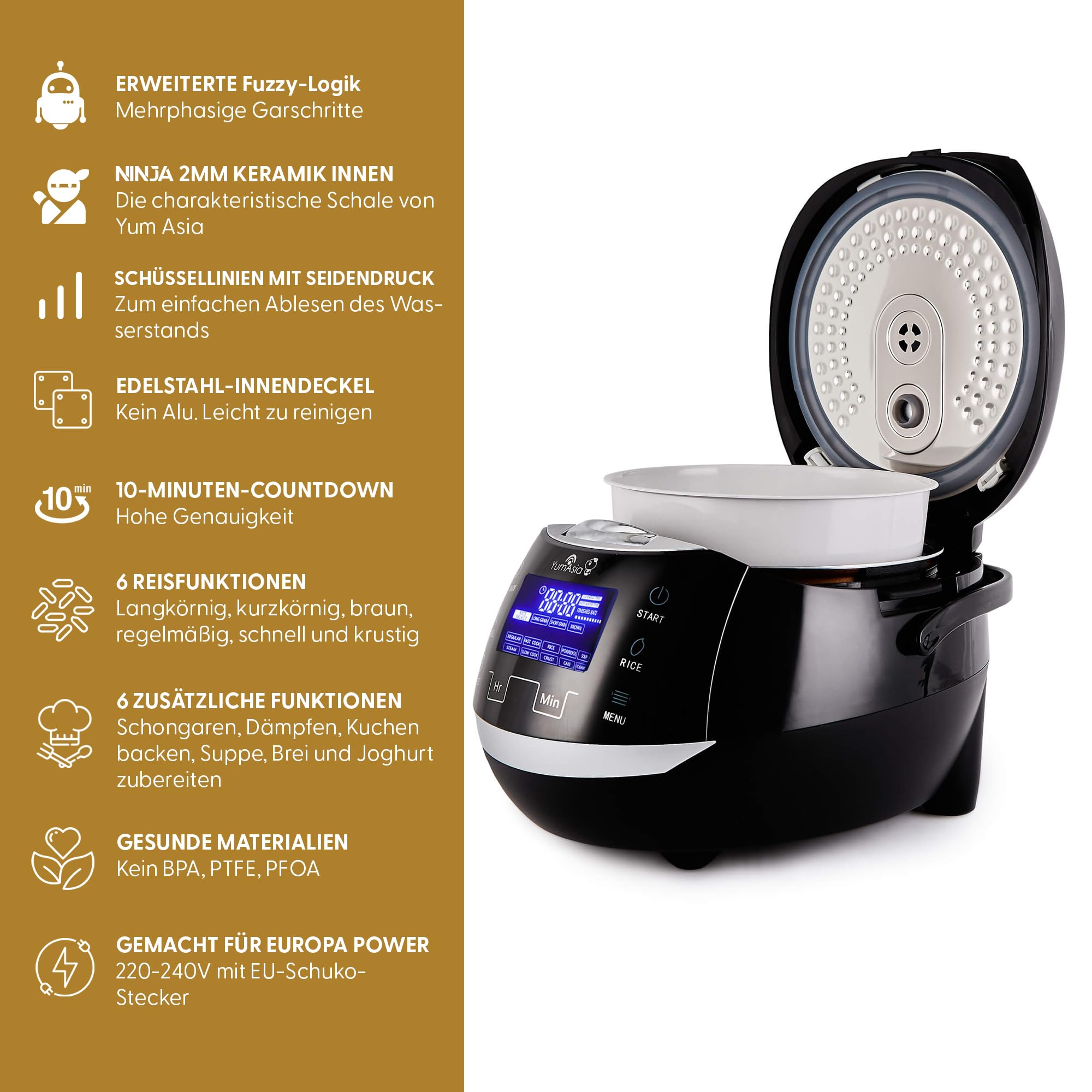 Yum Asia Sakura Reiskocher mit Keramikschale und Advanced Fuzzy Logic (8 Tassen, 1,5 Liter), 6 Reiskochfunktionen, 6 Multikocherfunktionen, Motouch LED-Display, 220-240V EU (schwarz und silber)