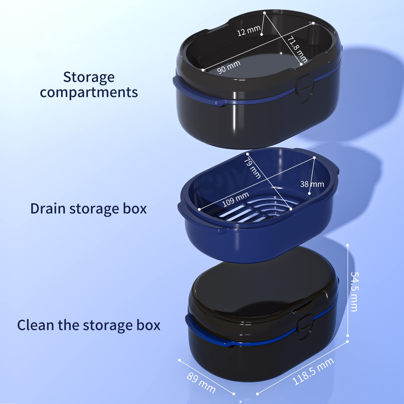 • Optimale Tiefe – Unsere Prothesenbehälter sind tief genug, um Zahnersatz vollständig einzutauchen und hygienisch zu reinigen. Das grössere Fassungsvermögen erleichtert auch das nächtliche Einweichen von Prothesen oder Retainern in Reinigungslösung.