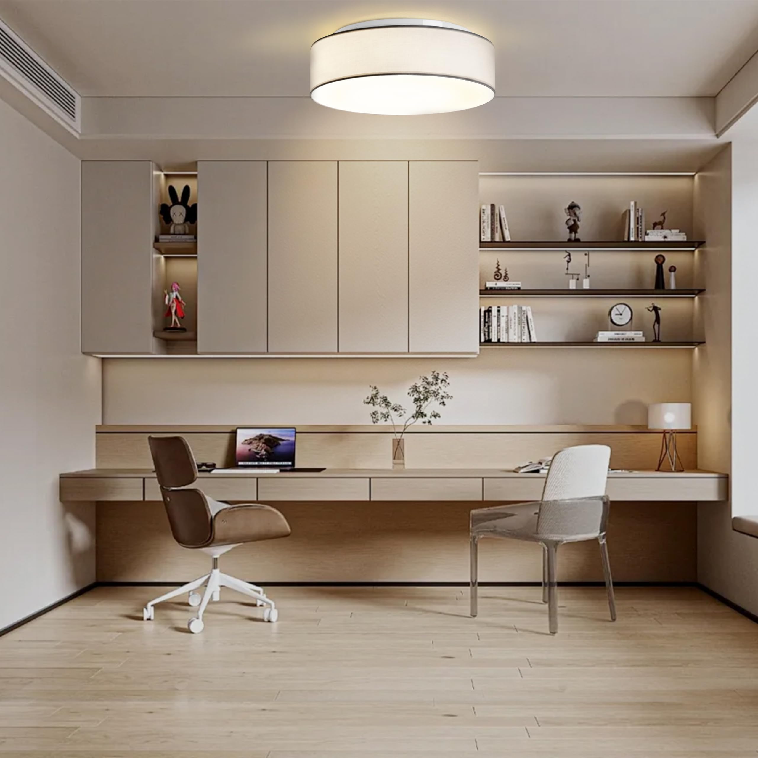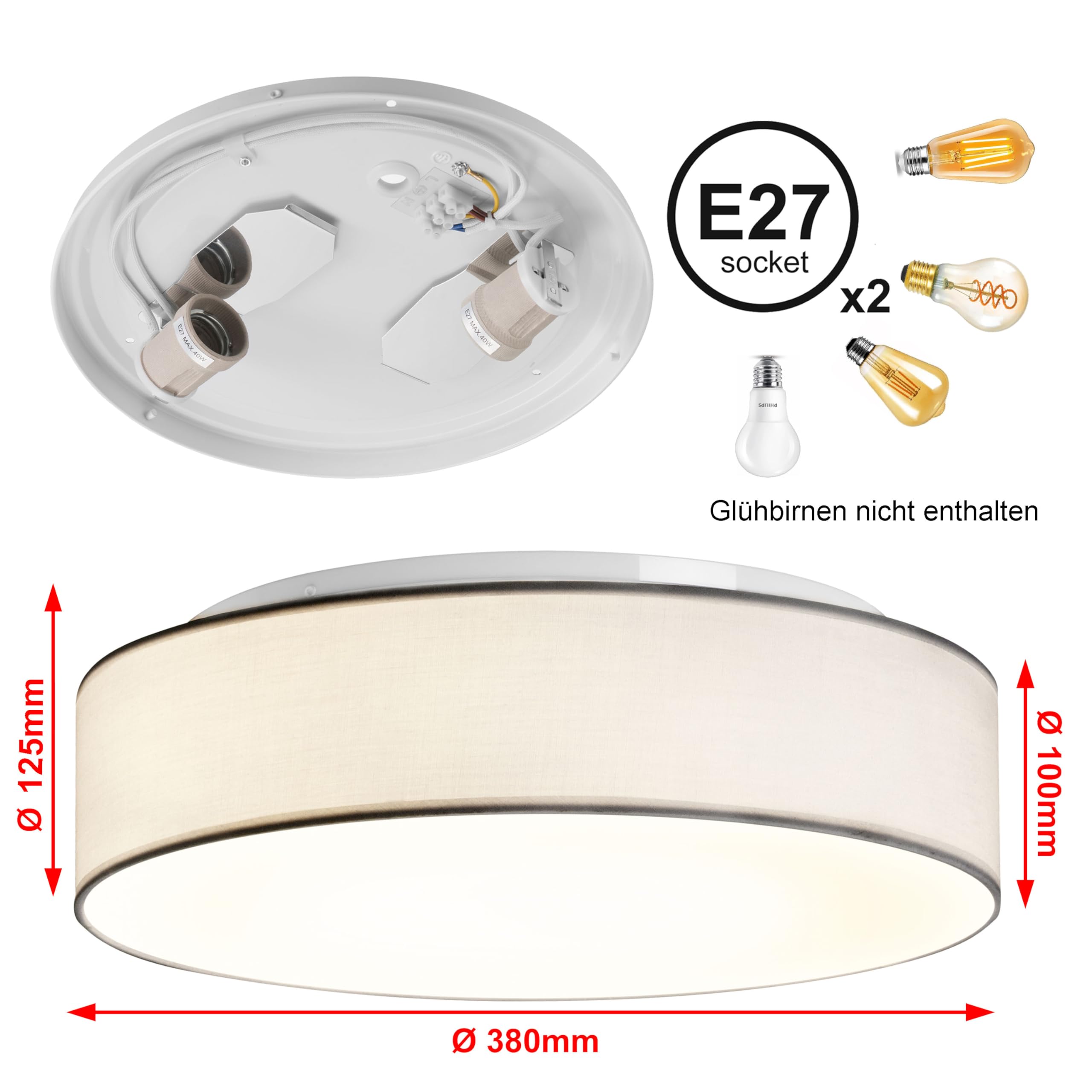 Zedelmaier Deckenlampe Stoff Rund 38cm E27x2 max.40W Deckenleuchte Weiss Stoffschirm Wohnzimmer Schlafzimmer Küche Flur Kinderzimmer Lampe Decke Lampenschirm