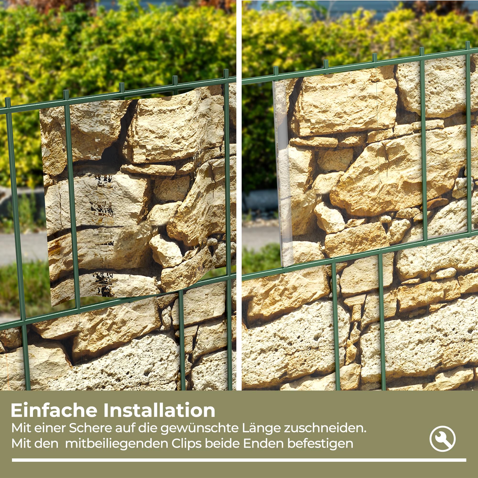 - 【Einfache Installation】Schneiden Sie die Sichtschutzfolie auf die erforderliche Länge, verweben den Sichtschutzstreifen mit den Gittern Ihres Zauns und befestigen Sie die Enden mit Befestigungsklammern.