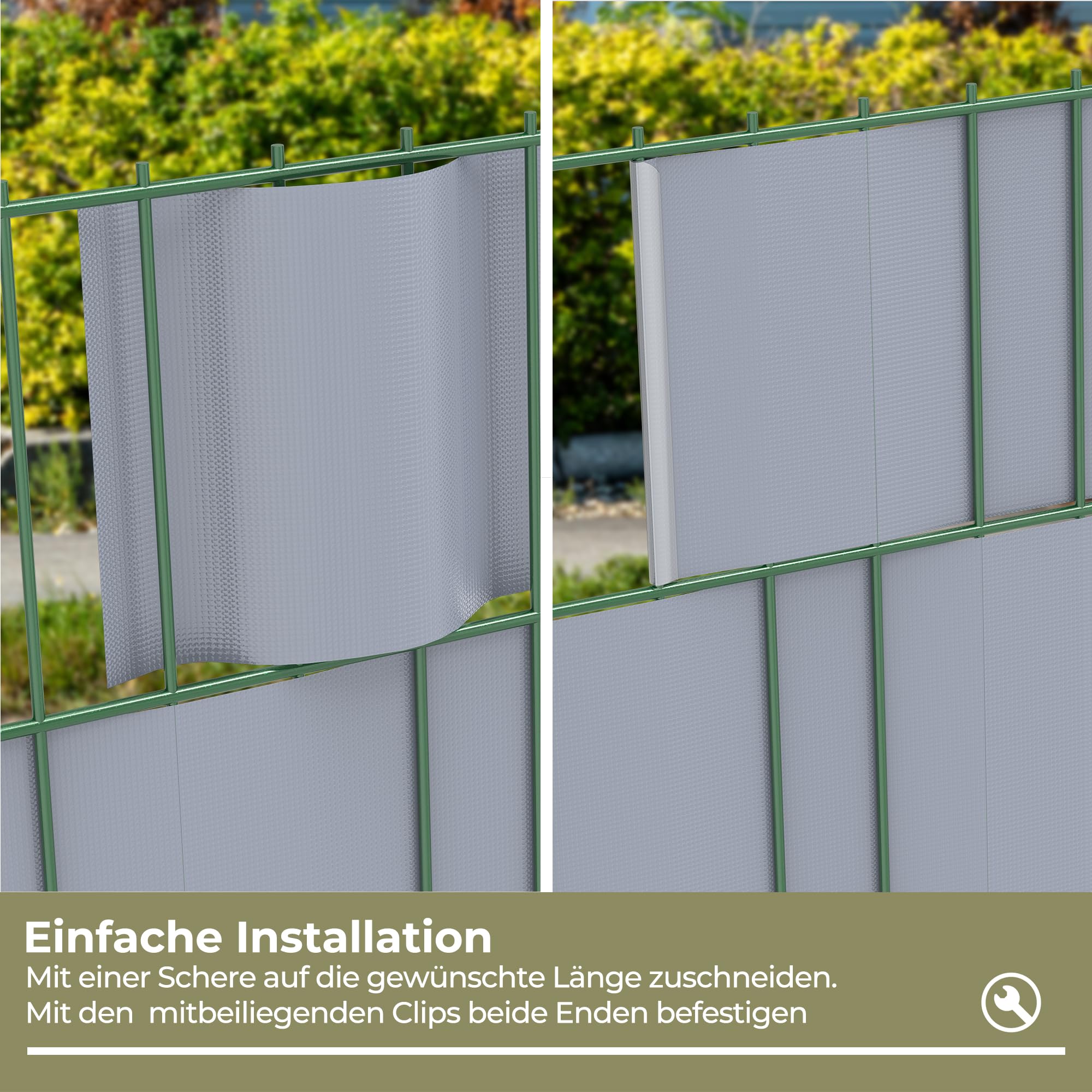 - 【Einfache Installation】Schneiden Sie die Sichtschutzfolie auf die erforderliche Länge, verweben den Sichtschutzstreifen mit den Gittern Ihres Zauns und befestigen Sie die Enden mit Befestigungsklammern.