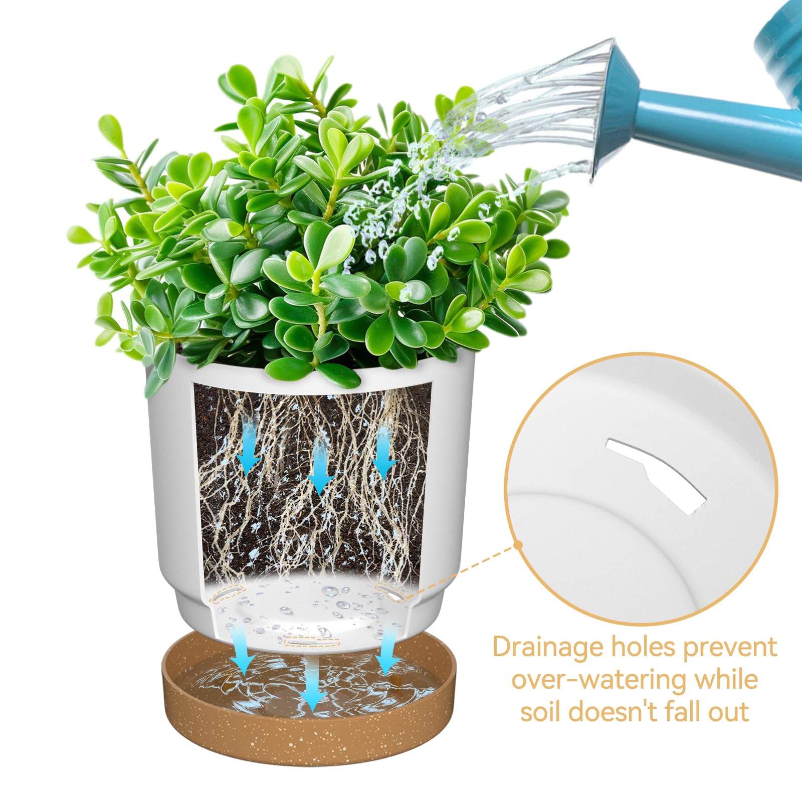 Der Übertopf wird mit 3 Drainagelöchern geliefert, um die Pflanzenpflege zu vereinfachen, so dass Ihre Pflanzen leicht zu giessen und Verstopfungen zu verhindern. Das einzigartige einteilige Tablett-Design ermöglicht die Befestigung des Pflanzgefässes am Pflanzgefäss, um Feuchtigkeit zu speichern und es Ihnen zu ermöglichen, den Übertopf leicht zu bewegen. Darüber hinaus können Sie das Tablett herausnehmen und den Pflanztopf leicht reinigen.
