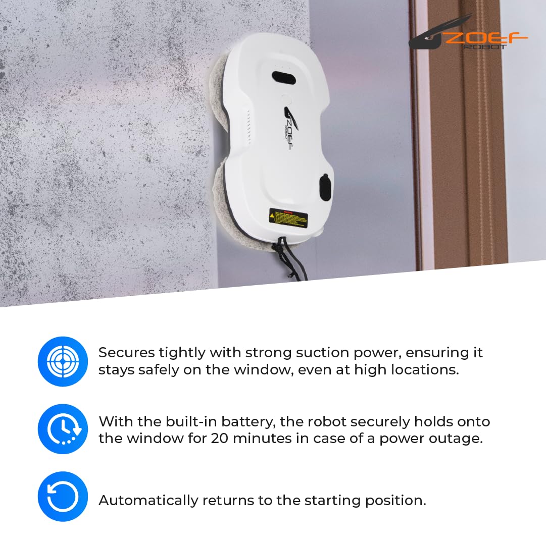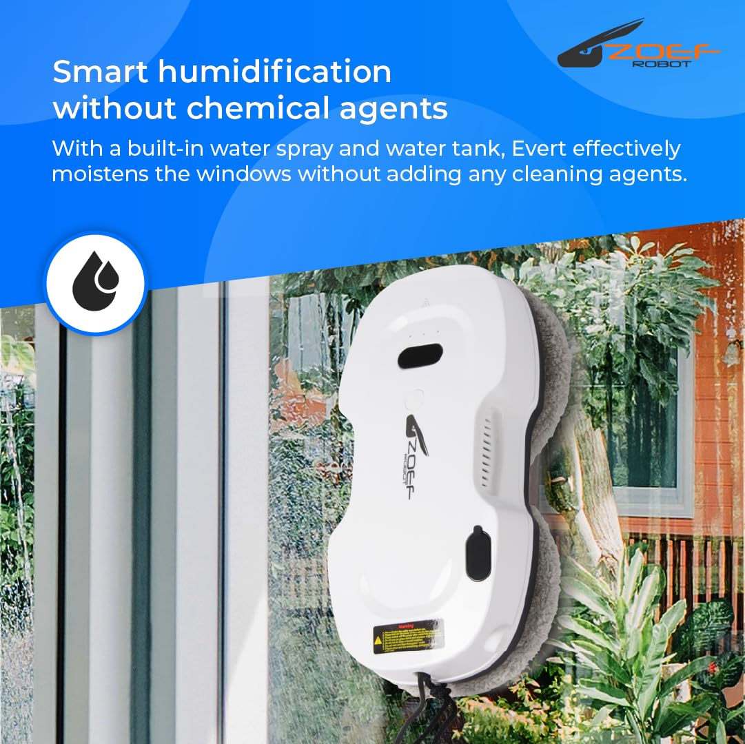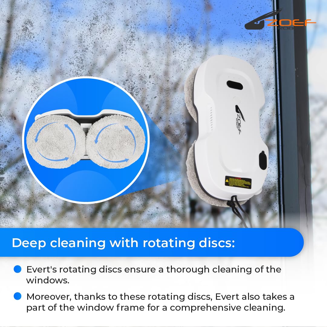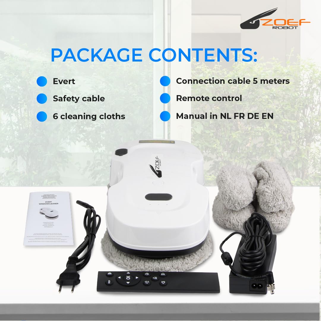 Evert nur Felsen saubere Fenster. Mit seinen kreisförmigen Scheiben und Wasserspray Ihre Fenster sowohl von innen als auch von aussen wieder kristallklar sauber. Evert eignet sich auch für Türen, Tische und Fliesenwände*.Ist die Reinigung von Fenstern nicht Ihr Hobby oder haben Sie einfach zu wenig Zeit dafür? Dann bieten wir die Lösung mit Evert - dem automatischen Roboter Fensterwäsche. Dieser praktische Reinigungsroboter ist für alle flachen Oberflächen geeignet. Evert bewegt sich in geraden Bahnen über das Fenster und nimmt dabei auch ein Stück der vorherigen Strecke mit, damit nichts übersprungen wird. Darüber hinaus verfügt der Roboter-Fensterreiniger über intelligente Software und ein Gyroskop, das sicherstellt, dass Evert weiss, wo er war, und wieder ordentlich zum Ausgangspunkt zurückkehrt, wenn er fertig ist. Der Roboter-Fensterreiniger hat ein 5 Meter Anschlusskabel, damit er überall gut zukommen kann. Dank des langen Kabels ist Evert auch ideal für schwer zugängliche oder hohe Fenster. Was kann Roboter Fensterreiniger Evert reinigen? Der Roboter-Fensterreiniger Evert eignet sich nicht nur für Fenster, sondern auch für andere flache Oberflächen wie Fliesenwände und Türen. Evert reinigt Fenster im Inneren wieder vollständig. Er ist besonders sehr nützlich bei grossen oder hohen Fenstern. Sie können die Fenster auch von aussen mit einem Fensterreiniger reinigen. Nützlich, wenn Sie in einer hohen Wohnung leben oder die Fenster auf dem Dachboden reinigen. Evert kann zur Reinigung von Badezimmerfliesen verwendet werden. Dabei ist es wichtig, dass die Fugen und Nähte der Fliesen nicht zu gross oder zu tief sind, sonst kann Evert nicht gut Vakuum saugen. Evert braucht immer einen Rahmen um das Glas herum und kann nicht an Fenstern ohne Rahmen funktionieren, wie einige Badschirme und Türen. n für rahmenlose Flächen aufgeordnet. Evert kann auch verwendet werden, um die Fenster Ihres Gewächshauses oder Überdachung von unten zu reinigen, aber auch hier sollte es einen hohen Rahmen >+/- 8mm sein. Evert kann sich kopfüber Vakuum saugen und zur Arbeit gehen. Dabei ist es wichtig, die Sicherheit im Auge zu behalten. Roboter Fensterreiniger Evert verwenden Evert hat ein schlankes Design und ist von jedem einfach und schnell zu bedienen. Die Tücher von Evert werden von selbst nass gehalten durch die automatische Sprayfunktion, die Sie mit einem milden Fensterreiniger und Wasser füllen. Dann legen Sie den Roboter auf das Fenster und verbinden Sie das Kabel. Um den Roboter einzuschalten, drücken Sie die Taste am Roboter, und dann wird der Saugmotor eingeschaltet. Um den Reinigungsprozess zu starten, können Sie Evert auf Knopfdruck einschalten. Es ist auch möglich, Evert über die Fernbedienung zu aktivieren. Evert hat keine App. Teile von Evert Evert verfügt über Reinigungstücher , die leicht zu entfernen und zu waschen sind. Diese Tücher können vor Gebrauch ein wenig feucht gemacht werden. Der Roboter sprüht jedoch auch das Fenster selbst nass. Dazu muss der Wassertank im Roboter mit der mitgelieferten Flasche gefüllt werden. Füllen Sie es mit Wasser und ein wenig mildes Reinigungsmittel oder Essig. Verwenden Sie dazu keine Glassex oder ähnliche Mittel, sie sorgen für eine Filmschicht an den Fenstern, die Evert nicht richtig funktioniert und Streifen hinterlässt. Neben dem Roboter und den Leinwänden kommt Evert mit einer Gesamtkabellänge von 5 Metern. Ein Sicherheitskabel, eine Fernbedienung und eine Bedienungsanleitung sind ebenfalls enthalten. Inhalt von Evert: Roboter Fensterreiniger Evert Fernbedienung Anschlusskabel, 5 Meter Sicherheitskabel 6 x Reinigungstücher Bedienungsanleitung NL FR DE EN