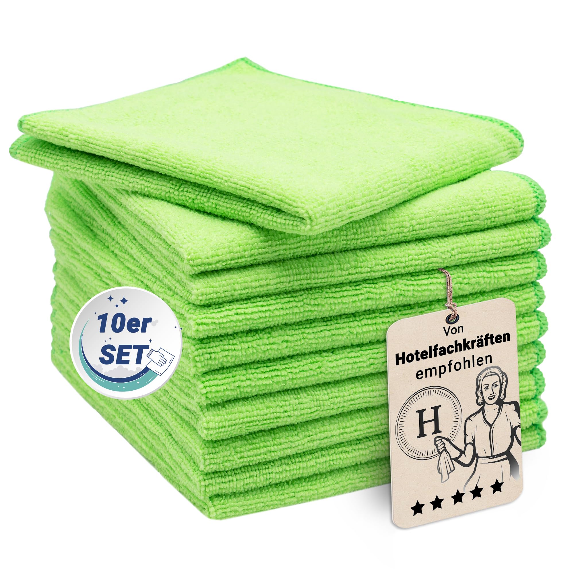 ZOLLNER 10er Set Mikrofasertücher für streifenfreien Glanz - flusenfreie und saugstarke Reinigungstücher - waschbar bis 60°C - 32x32cm in grün - Hotelqualität