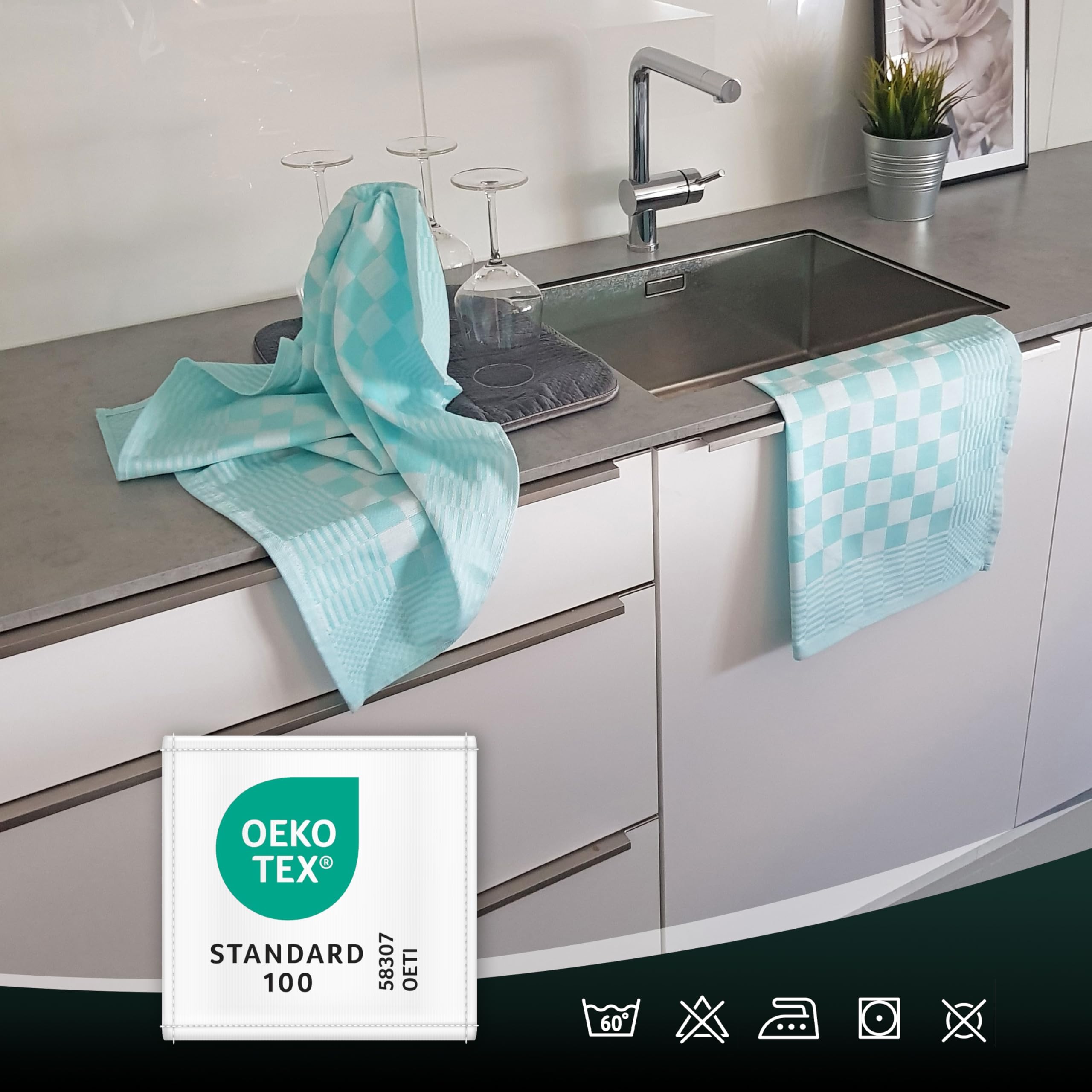 ZOLLNER 12er Set Geschirrtücher Baumwolle in 65x65 cm - extrem saugstarke und robuste Küchentücher - waschbar bis 60°C – in Mint kariert - Gastronomiequalität - Oeko Tex® Zertifiziert