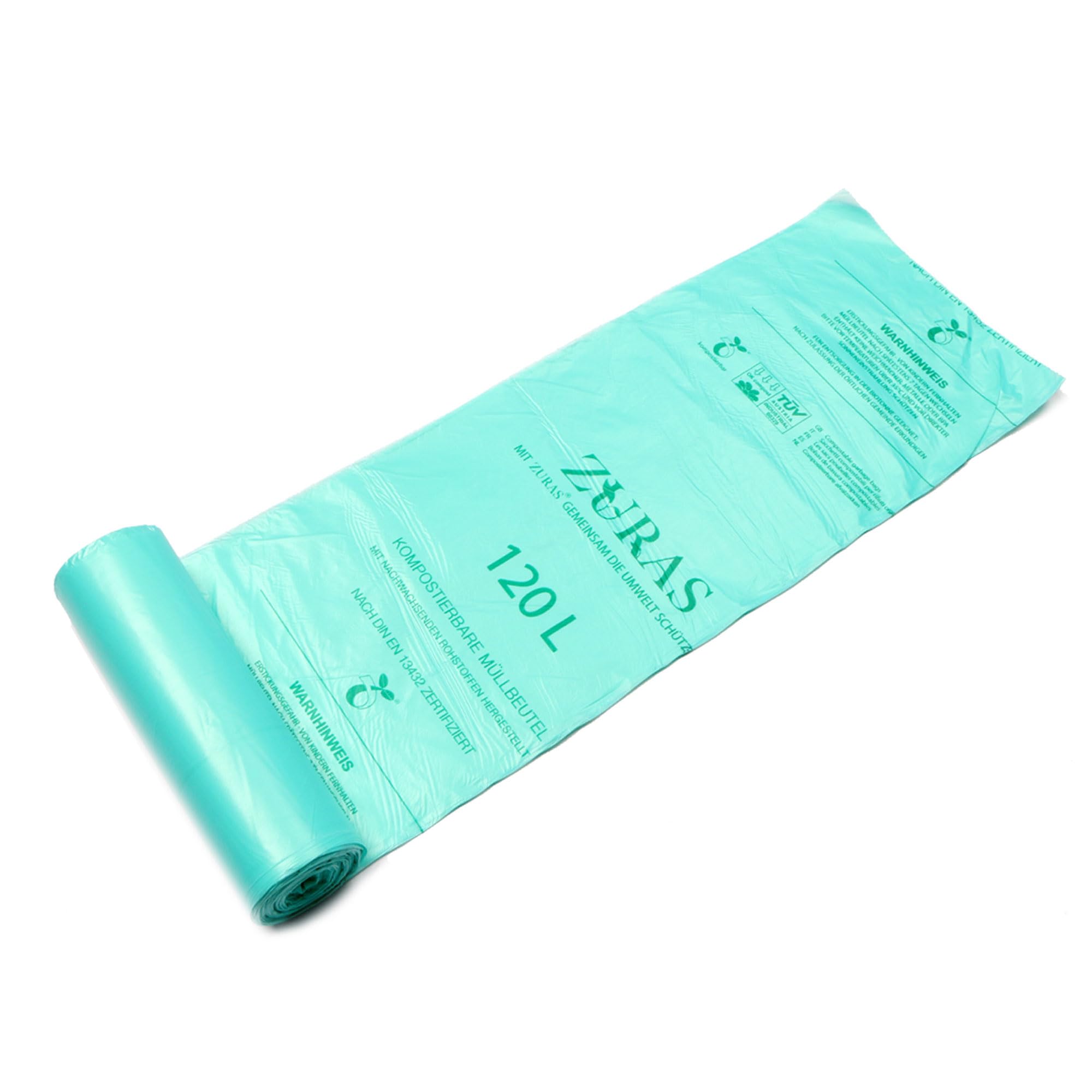 ZURAS® 120/140 Liter 88x130 cm Biomüllbeutel 30 Stk. kompostfähige, biologisch abbaubare Müllbeutel auf pflanzlicher Basis, DIN EN 13432 zertifiziert und geprüft, reissfest und wasserdicht