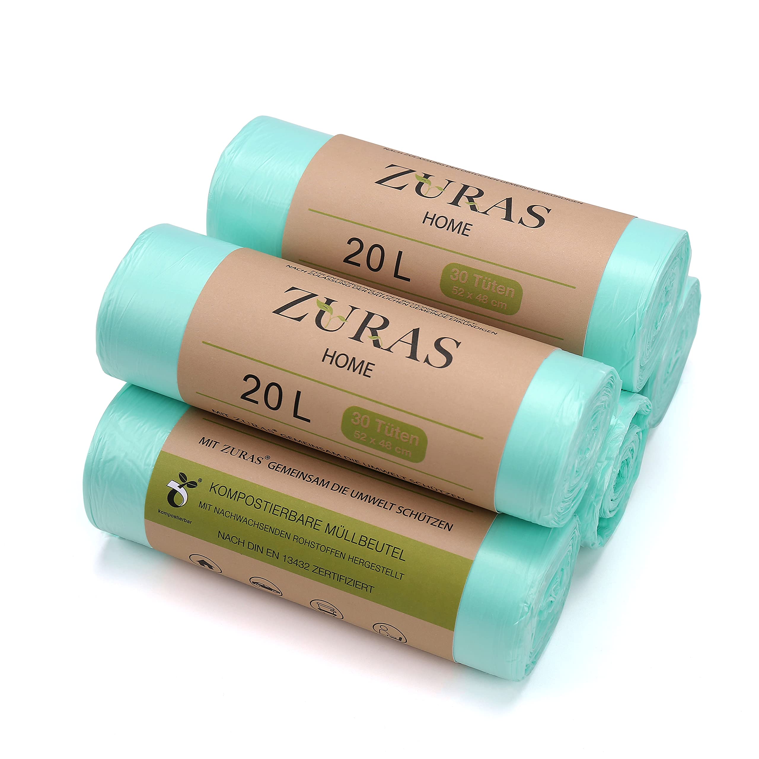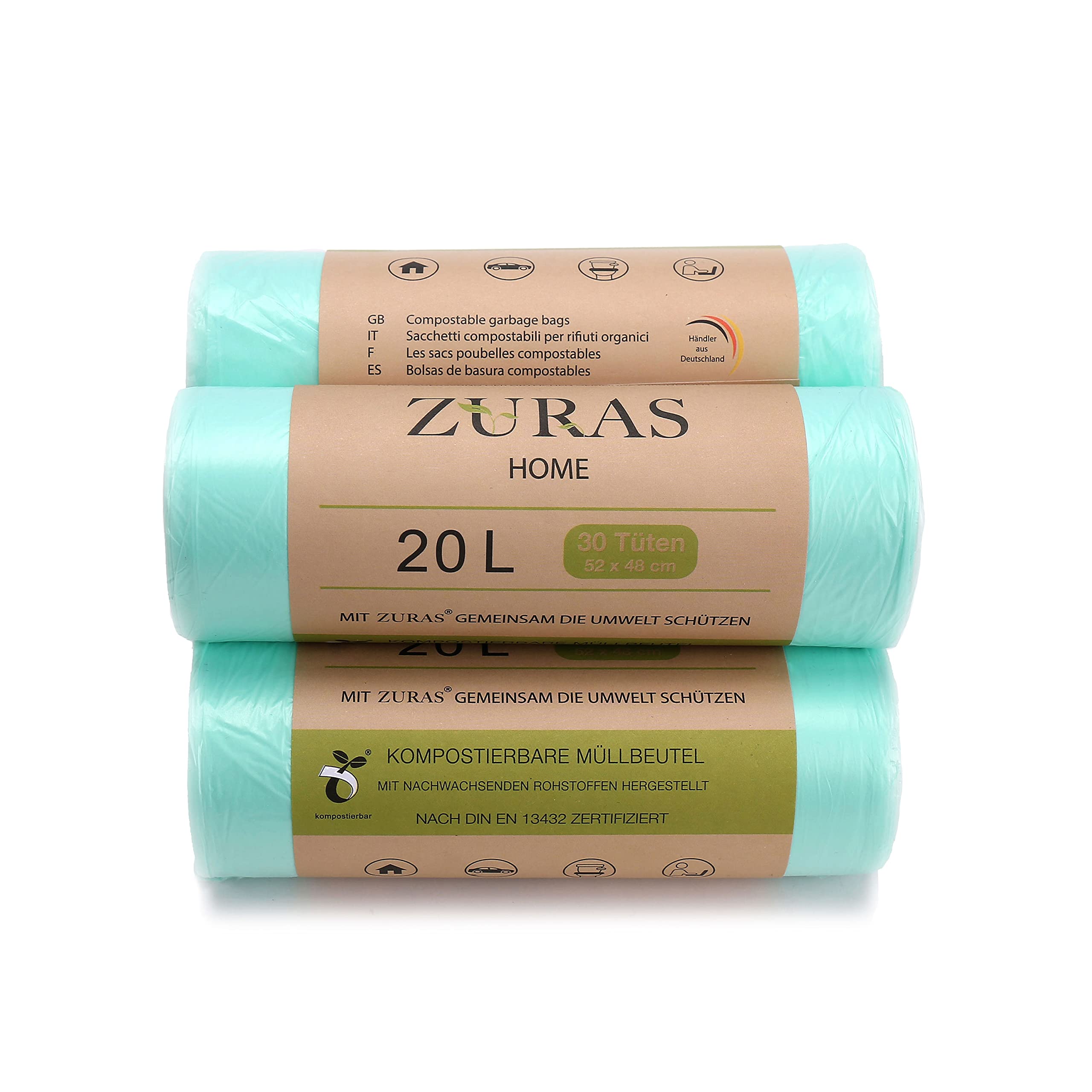 ZURAS 20 Liter Biomüllbeutel 150 Stk. kompostfähige, biologisch abbaubare Müllbeutel auf pflanzlicher Basis, DIN EN 13432 zertifiziert und geprüft, reissfest und wasserdicht