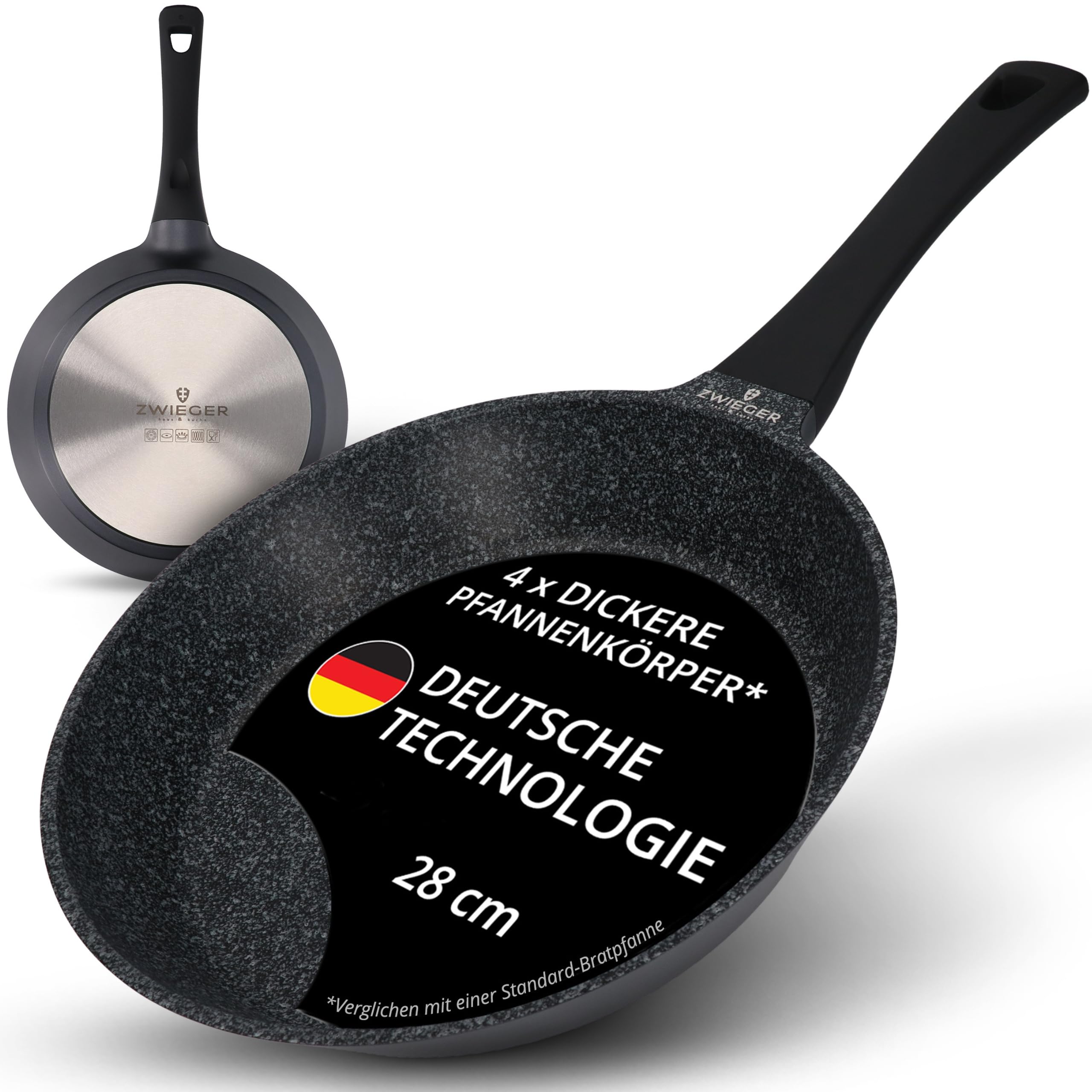 ZWIEGER Hochwertige Bratpfanne 28 cm – beschichtete Pfanne 28 cm, Aluguss, vollflächiger Edelstahlboden, für alle Herdarten (inklusive Induktion) geeignet – Antihaft, PFOA- & PFOS-frei
