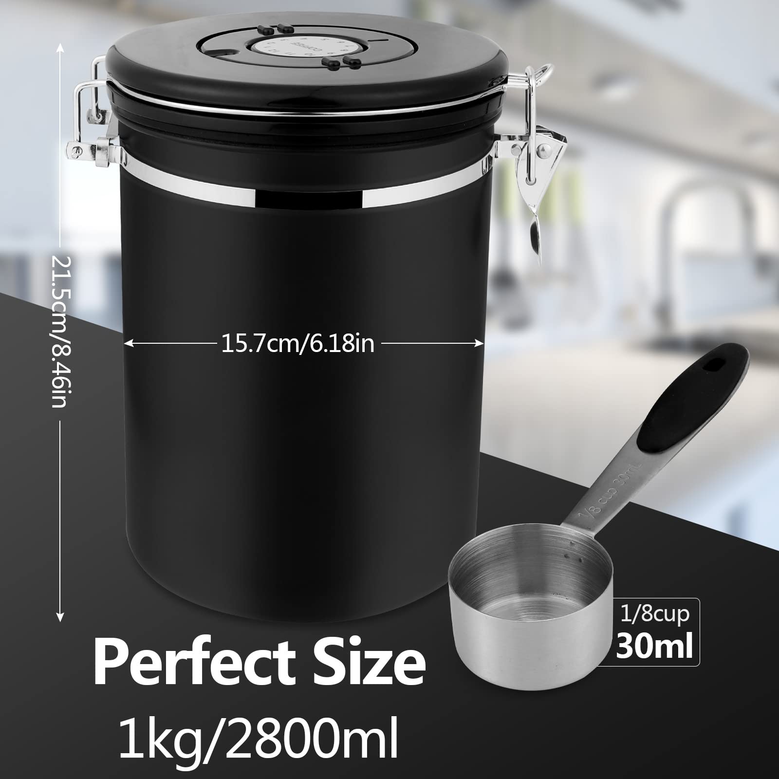 ZWOOS Kaffeedose Luftdicht 1kg - Kaffeebohnen Behälter aus Edelstahl mit CO2-Ventil - mit Messlöffel (2,8 L Schwarz), 3321922